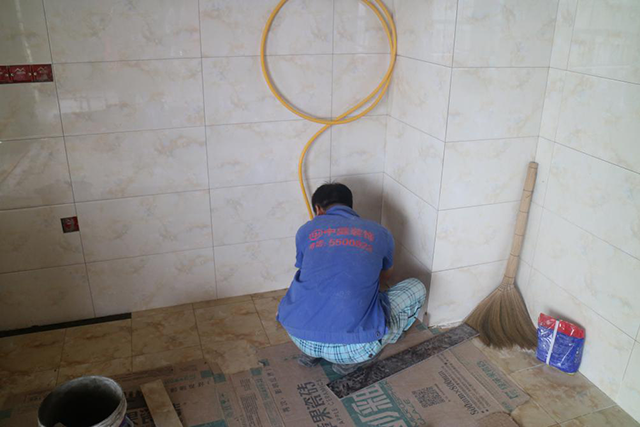 師傅正在忙著給廚房進行鋪貼瓷磚,專業(yè)的鋪貼流程,做完一個區(qū)域馬上做地膜保護,正在鋪貼的區(qū)域也用紙皮做臨時保護,防止沙子刮花地面。