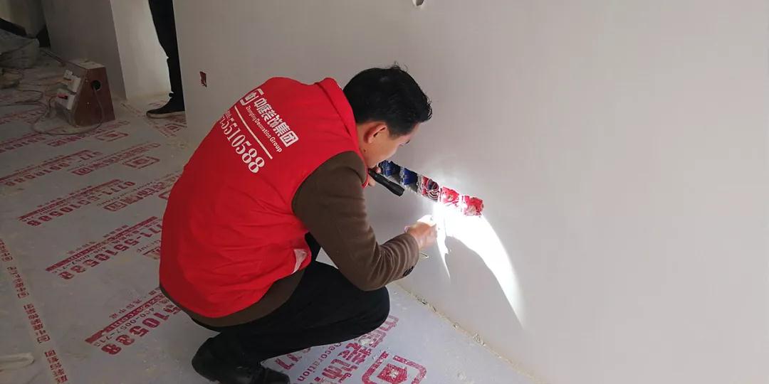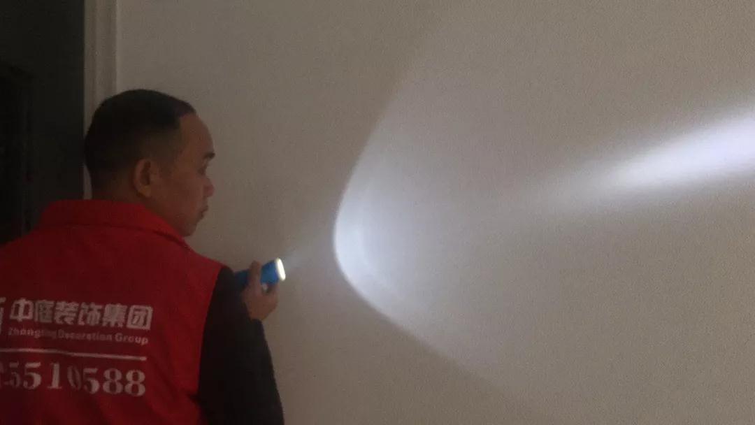 集團工程質(zhì)量管理中心總監(jiān)吳總用強光手電筒檢查刮膩子平整度