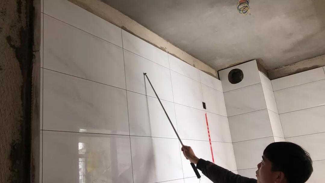 現(xiàn)場檢查是否按圖施工,檢查墻面鋪磚平整度