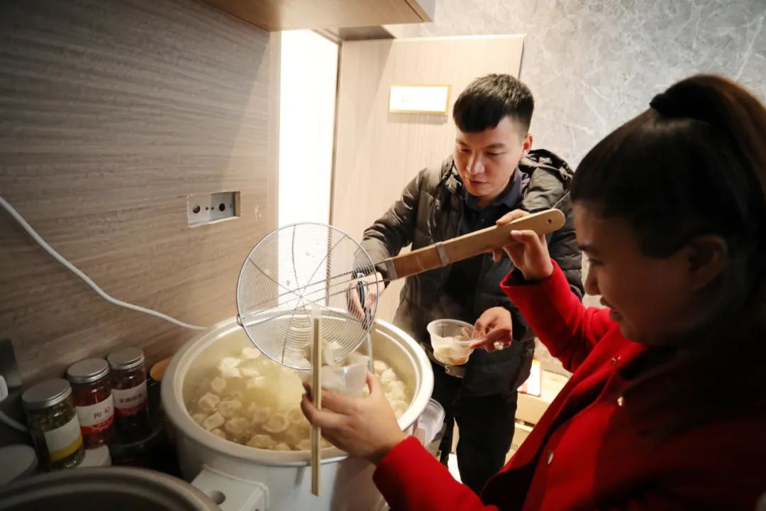 茶水間里煮著餃子湯圓熱氣騰騰,溫暖了寒冬里一顆顆思念故鄉(xiāng)的心。
