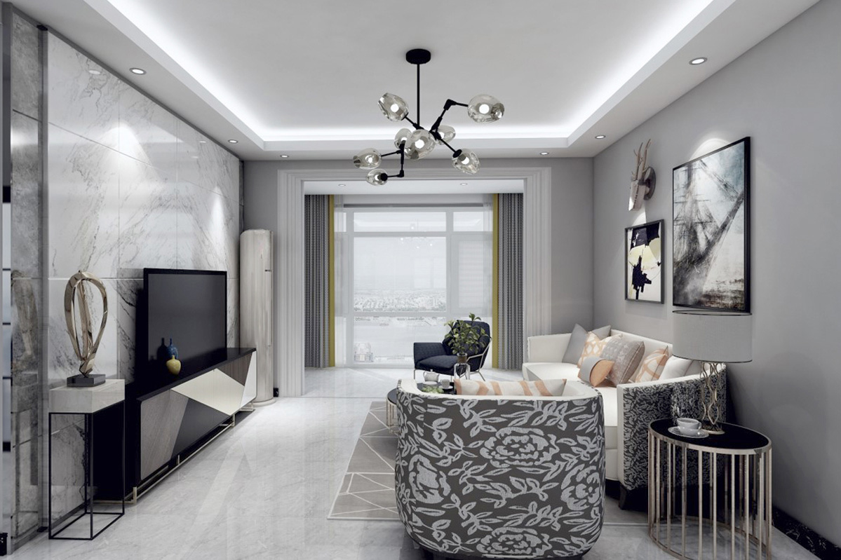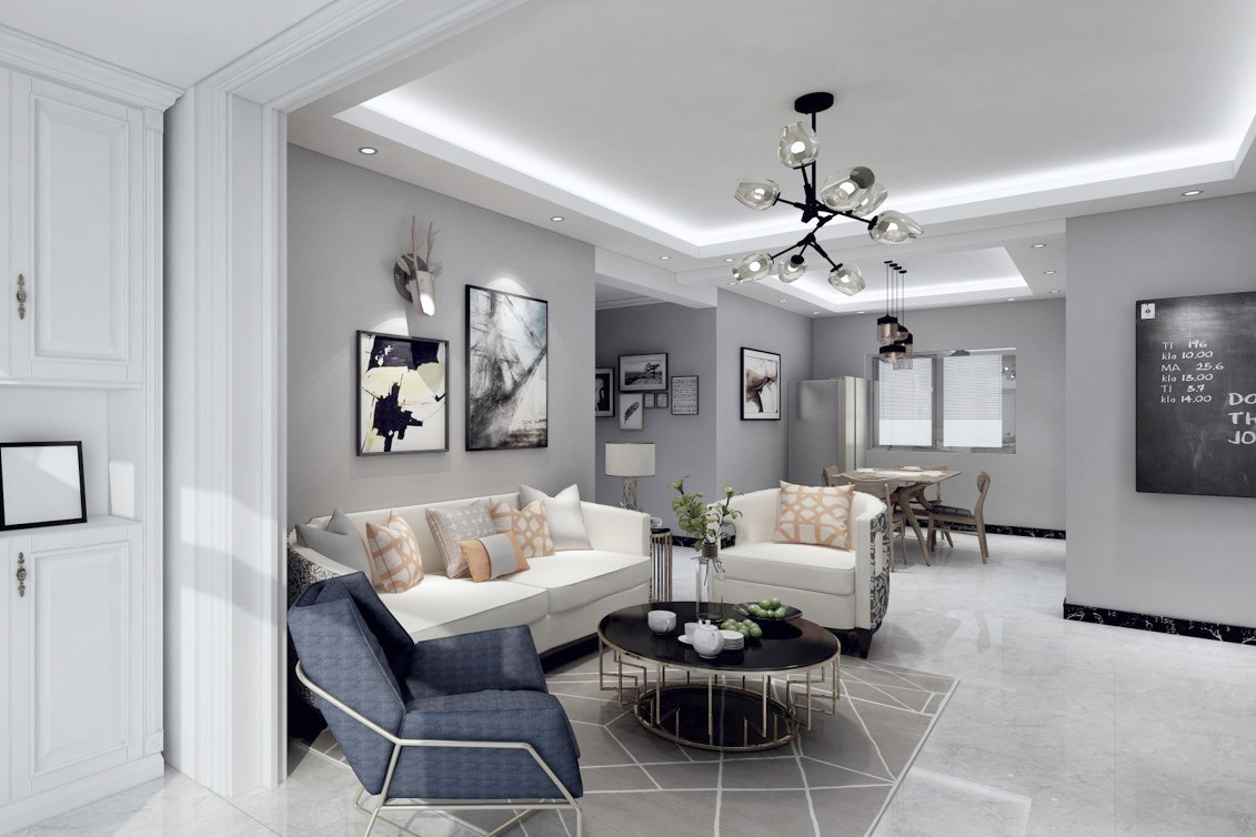 房屋整體主色調(diào):黑白灰,踏入房門首先看到的是灰色墻面和黑色的矮柜形成鮮明的對比。給人的第一感覺有浪漫、時尚,卻不失美式中特有的奢華。墻面以灰色為主,地板以深灰色為主色。整體空間的動線非常流暢,給人很舒服的感覺??蛷d整體設(shè)計偏美式,硬裝選色大氣,配以布藝沙發(fā)的軟裝,硬裝配以現(xiàn)代風(fēng)格的電視背景墻,整體給人的感覺穩(wěn)重而簡潔。美式的顏色不可過于濃重,在混搭風(fēng)格中,只可點綴,它的作用是調(diào)節(jié)空間整體的氣氛。