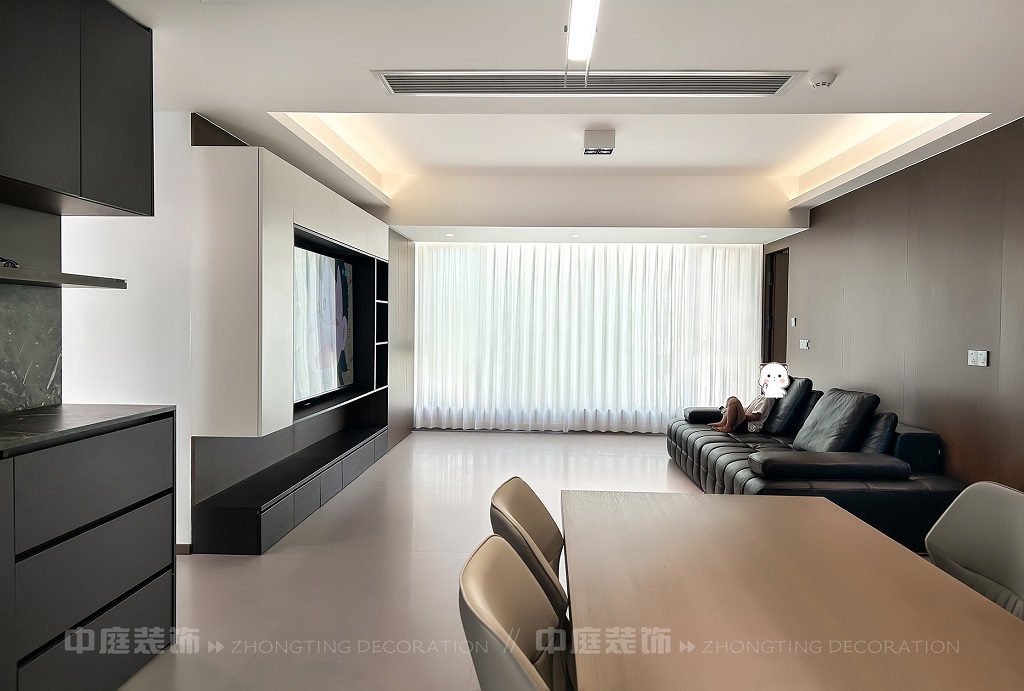 瀏覽量:72客廳以現(xiàn)代黑白灰極簡風格為核心,大面積白紗簾引入自然光線,黑色皮質(zhì)沙發(fā)質(zhì)感高級。開放式布局,深灰櫥柜與木質(zhì)餐桌形成材質(zhì)對比,線性吊燈提升精致感,功能與美學兼具,營造現(xiàn)代簡約的烹飪用餐氛圍。輕柔窗簾與柔和燈光,打造靜謐休息空間。精致的材質(zhì)選擇與合理的功能規(guī)劃,詮釋了“少即是多”的現(xiàn)代簡約居住美學。