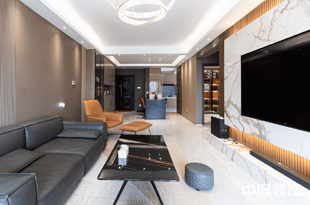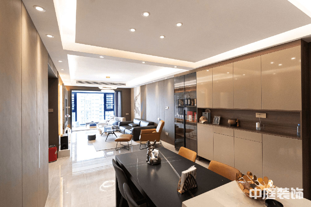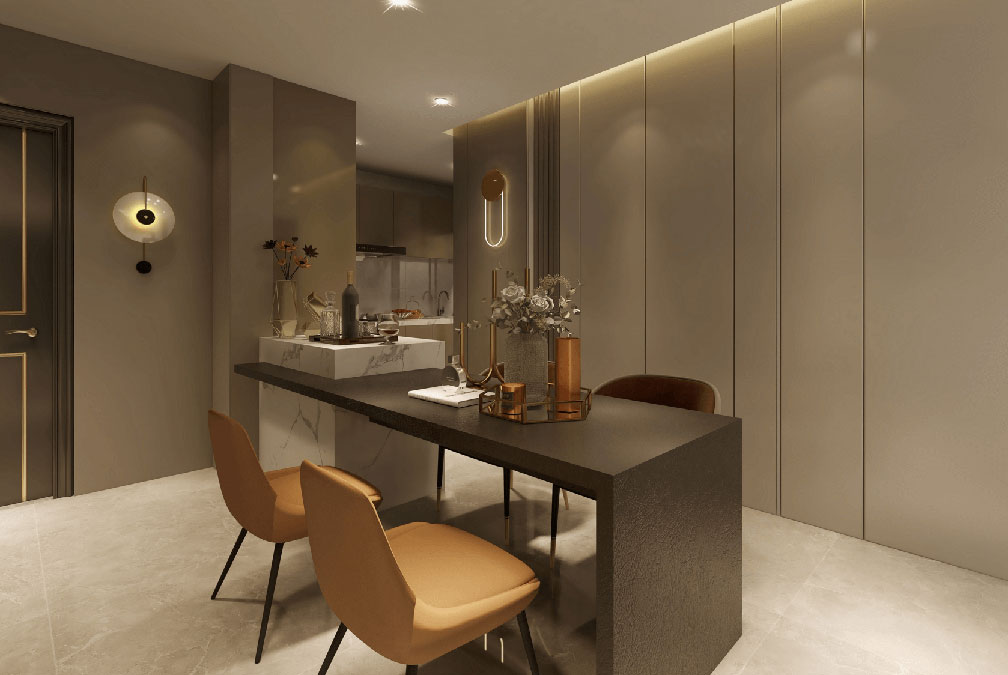 輕奢風(fēng)格的空間以金屬、皮革的中性色調(diào)為主,用色彩的純度傳遞細(xì)膩的質(zhì)感。